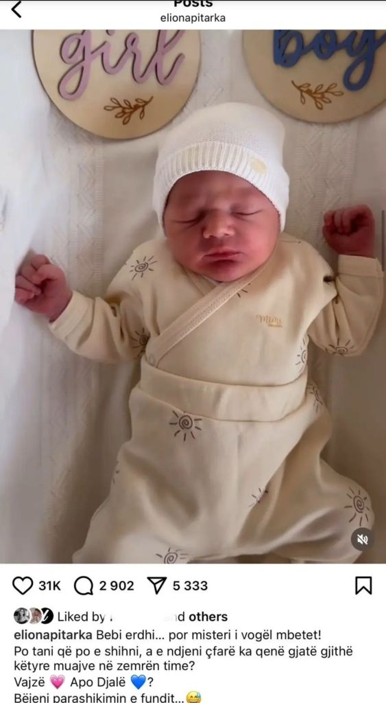 Pasi mbajti të fshehtë gjininë gjatë gjithë shtatzënisë (një zgjedhje personale dhe e respektueshme) Eliona publikoi menjëherë pas lindjes një quiz në Instagram ku ndjekësit ftoheshin të gjenin: është vajzë apo djalë?