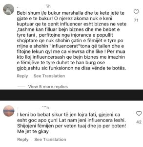 Askush nuk mohon që të qenit influencues është sot një profesion më vete. Por, një pjesë e ndjekësve në Shqipëri po ngrenë shqetësimin se përdorimi i fëmijëve si pjesë e këtij “produkti online” po tejkalon çdo kufi. Komente si “i kanë kthyer bebat në biznes”, “nuk janë më fëmijë, janë quiz-e online”, apo “shijojeni për vete, jo për botën” janë shenja të një lodhjeje kolektive ndaj spektaklit të pandërprerë në rrjet.