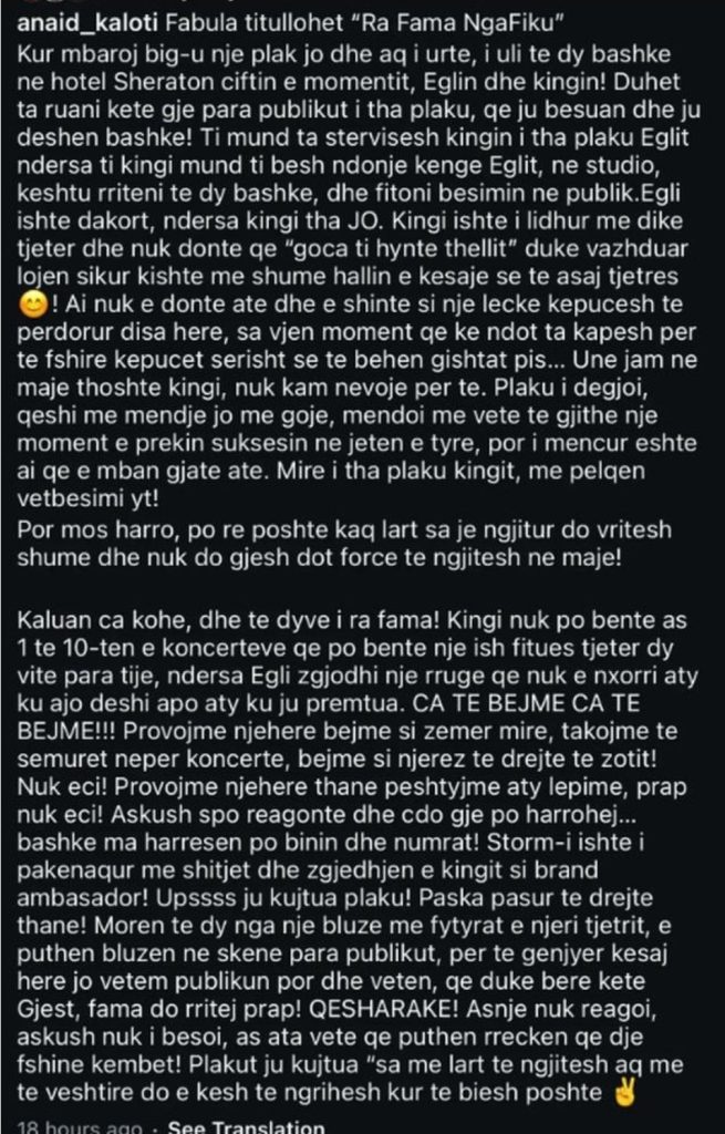 Një postim nga Anaid Kaloti po bën xhiron e rrjeteve sociale, duke hedhur dritë mbi prapaskenat e një marrëdhënieje të shumëkomentuar mes Egli dhe Gjestit. Sipas tij, marrëdhënia e tyre nisi si një aleancë strategjike që duhej të ruhej për hir të publikut pas përfundimit të Big Brother VIP Albania.