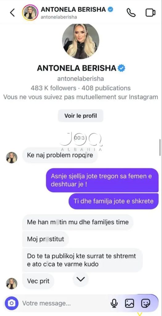 “Ke naj problem rop*ire?”, i shkroi ajo përmes DM-ve, duke nisur një seri sharjesh, fyerjesh dhe madje duke i kërkuar edhe adresën për “ta sqaruar muhabetin”.