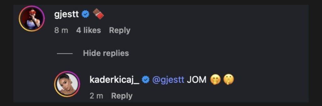Një shkëmbim i shkurtër mes Gjestit dhe Kader Kicajt ka bërë xhiron e rrjeteve sociale, duke ndezur menjëherë spekulime për një afrim të mundshëm mes tyre. Në një postim të fundit në Instagram, Gjesti ka komentuar me një emoji çokollate, një detaj i vogël që ka ngjallur shumë kureshtje. Por vëmendjen më të madhe e ka marrë përgjigjja e menjëhershme e Kaderit: