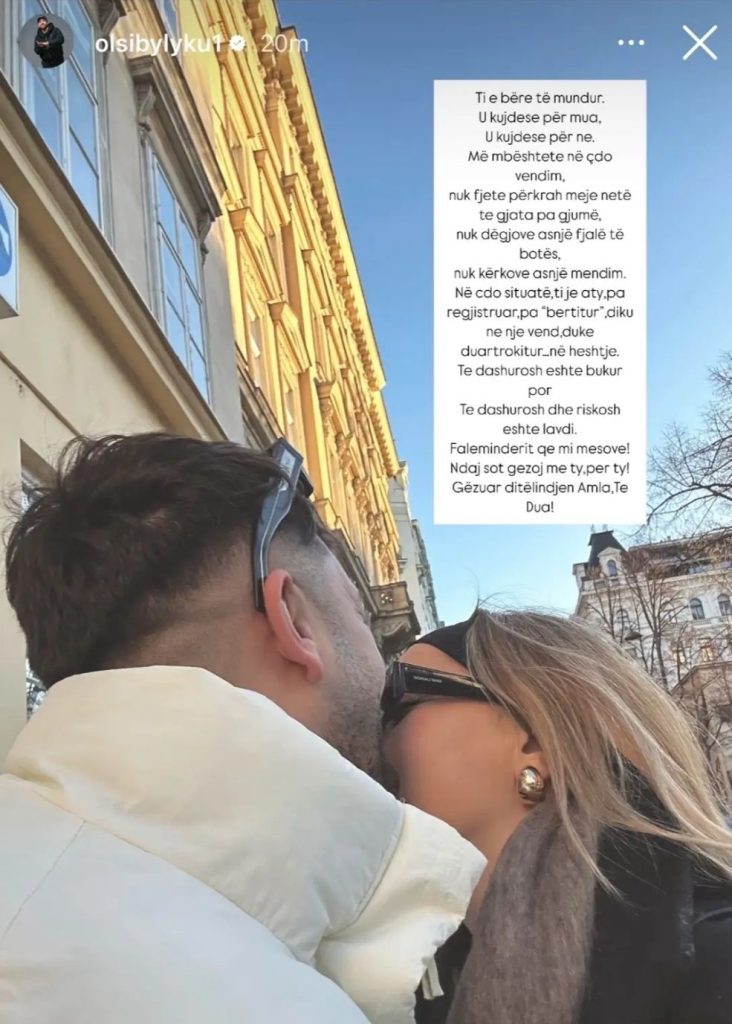 Në mesazhin e tij, Olsi shpreh mirënjohjen për mbështetjen dhe përkushtimin që ajo ka treguar në çdo hap të marrëdhënies së tyre. Ai rrëfen sesi ajo ka qenë aty pa kushte, pa kërkuar shpjegime, thjesht duke dashur dhe qëndruar pranë tij.