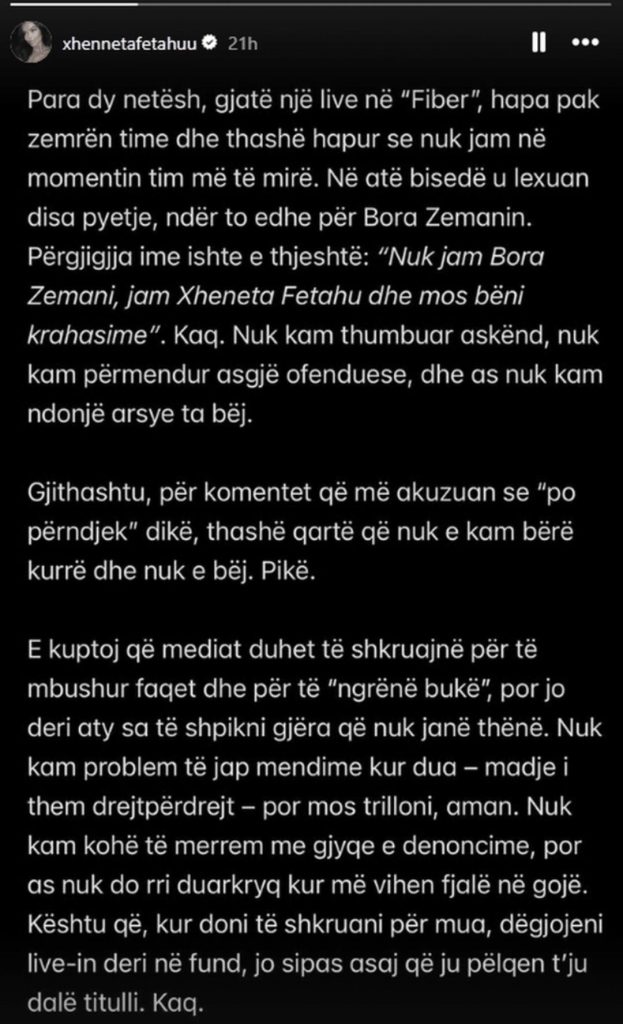 Së fundmi, përmes një postimi në InstaStory, Xheneta ka sqaruar situatën: