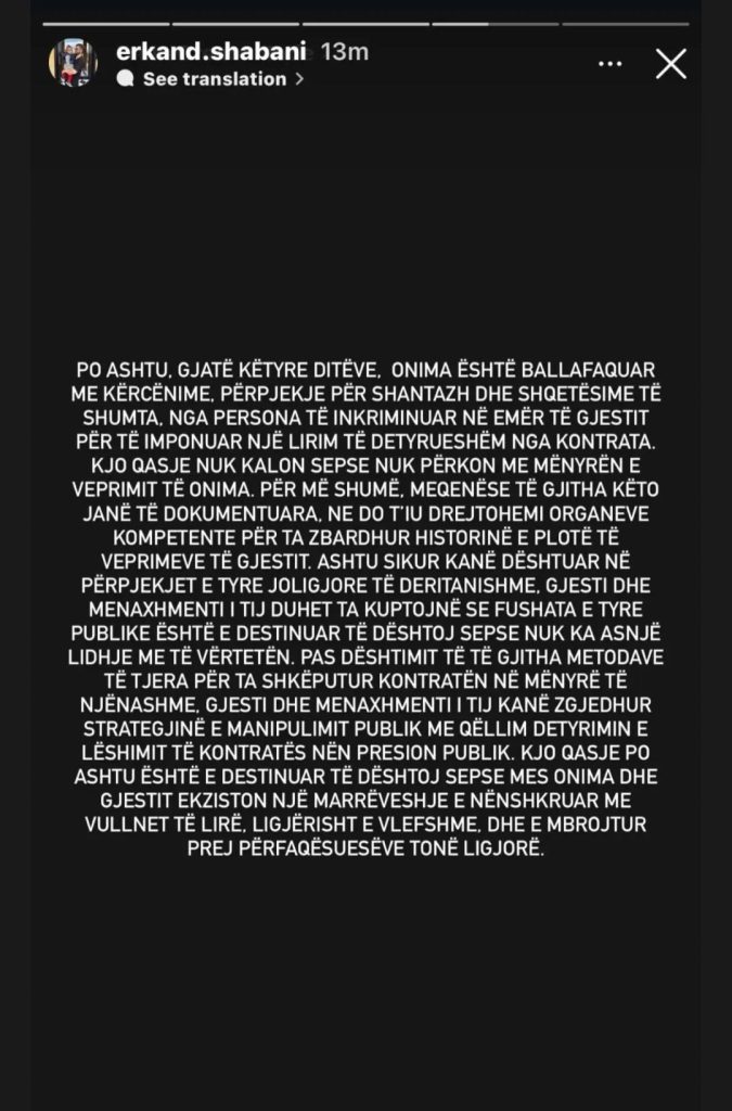 Erkand Shabani, drejtues i platformës “Onima”, ka reaguar publikisht duke shprehur “keqardhje të thellë” për atë që e cilëson si “lajme të rreme” të shpërndara nga artisti dhe menaxhmenti i tij. Sipas Shabanit, konflikti lidhet me kërkesën e Gjestit për t’u liruar nga kontrata për shpërndarjen dhe monetizimin e veprave të tij artistike , një marrëveshje që, sipas Onimës, është nënshkruar me vullnet të lirë dhe mbetet ligjërisht e vlefshme.