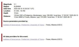 Pasditen e të premtes, një tërmet ka tronditur territorin e Shqipërisë, duke u ndjerë edhe në kryeqytet. Sipas të dhënave paraprake, lëkundjet kanë pasur një magnitudë prej 3.1 ballësh.
