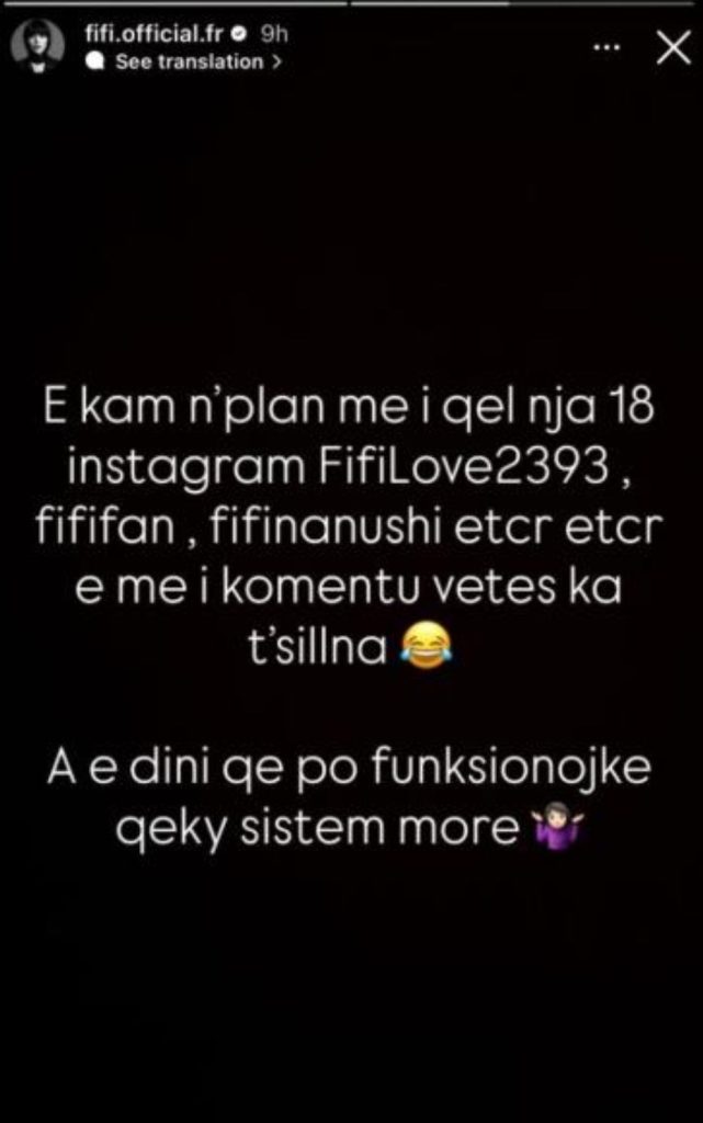 “E kam n’plan me i qel nja 18 Instagram FifiLove2393, Fififan, Fifinanushi etj. etj., e me i komentu vetes ka t’sillna. A e dini që po funksionojke qiky sistem more?”