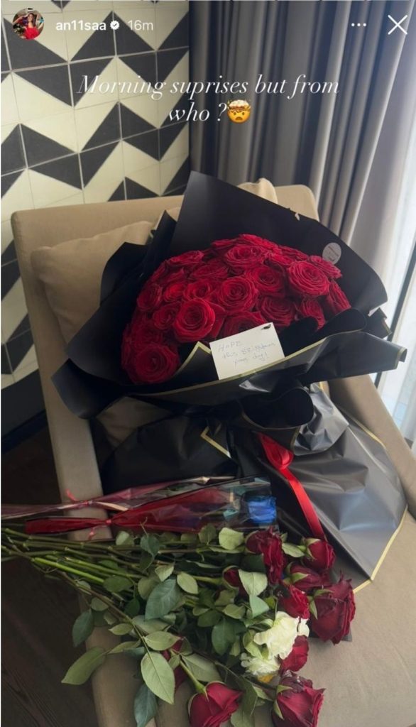 Në instastory, ajo publikoi një buqetë me trëndafila të kuq dhe dhurata të tjera, duke e shoqëruar me mbishkrimin: “Morning surprises but from who?”, pa zbuluar se nga kush i kishte marrë.