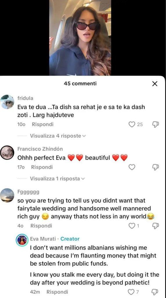 “Nuk dua që miliona shqiptarë të më dëshirojnë vdekjen sepse po mburrem me para që mund të jenë të vjedhura nga fondet publike. E di që më ndjek çdo ditë, por ta bësh këtë një ditë pas dasmës tënde është më shumë se patetike.”