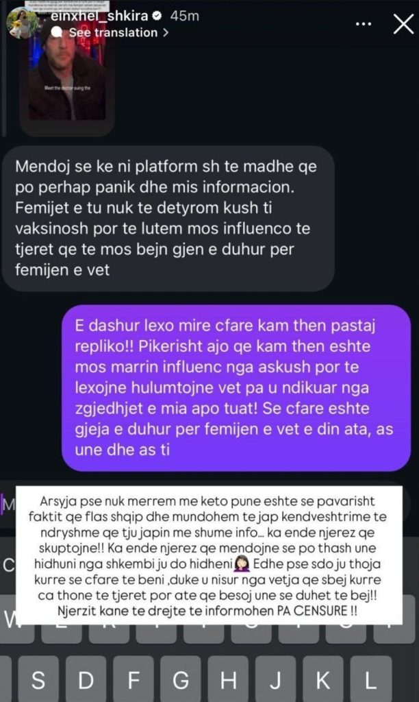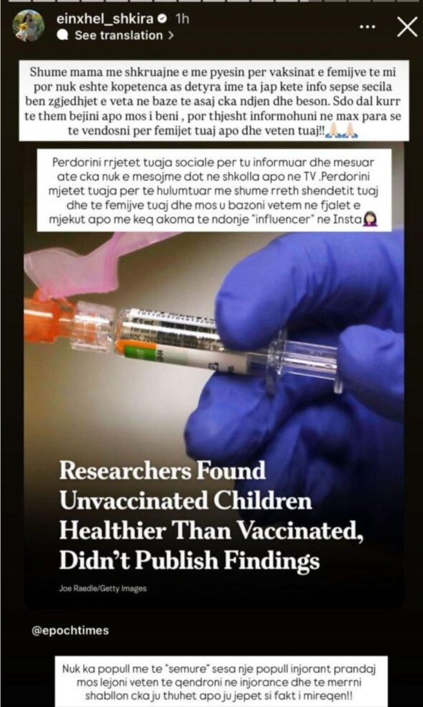 Ish finalistja e Big Brother VIP Albania, Einxhel Shkira, ka ndarë me ndjekësit e saj në “Instagram Story” disa mendime lidhur me vaksinimin e fëmijëve, duke theksuar se çdo prind duhet të marrë vendimet vetë për familjen e tij.