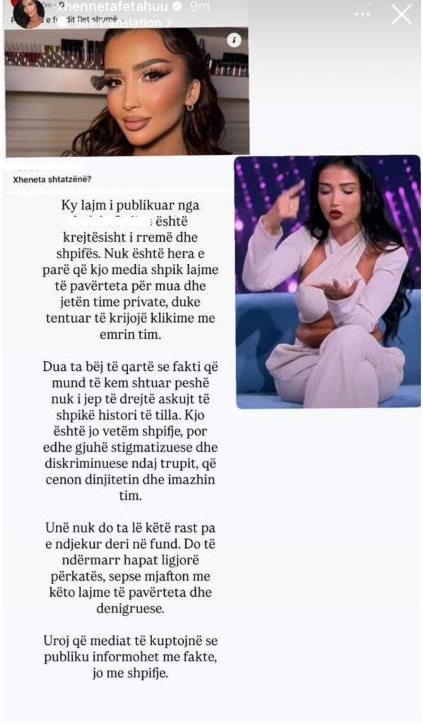 Por ajo nuk ka qëndruar në heshtje. Me një reagim të drejtpërdrejtë në Instagram, Xheneta ka zgjedhur t’i japë fund çdo spekulimi. “Nuk e di pse shpikni çdo ditë diçka të re për mua. Nuk jam shtatzënë dhe nuk ka asgjë të vërtetë në atë që po qarkullon”, shkruan ajo duke nënvizuar se vetëm ka humbur peshë kohëve të fundit.