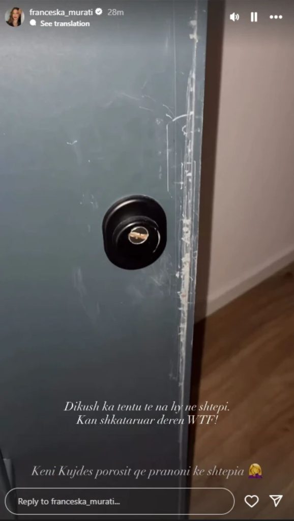 Përmes një postimi në rrjetet sociale, Françeska ka ndarë me ndjekësit një video ku tregon derën e dëmtuar të shtëpisë dhe gjurmët e tentativës për thyerje. “Dikush ka tentuar të na hyjë në shtëpi. Kanë shkatërruar derën. Keni kujdes porositë që pranoni në shtëpi”, ka shkruar ajo, duke lënë të kuptohet se incidenti mund të jetë lidhur me një dorëzim i dyshimtë.