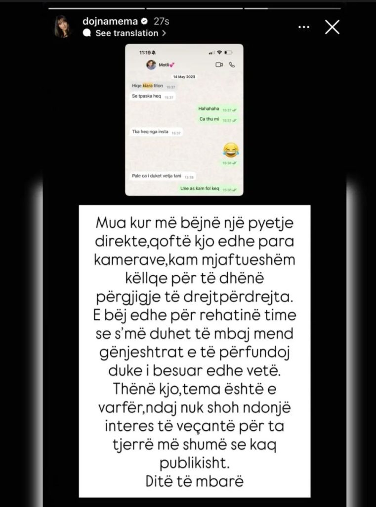 Pas zhurmës që u krijua në rrjet për ndjekjen dhe heqjen nga Instagrami mes saj dhe moderatores Kiara Tito, Dojna Mema ka reaguar në Instastory me një postim. Ajo ka publikuar një bisedë private në WhatsApp ku i thuhet nga motra e saj “Hiqe Kiara Titon”, ndërsa më pas ka ndarë një mesazh të gjatë duke theksuar se gjithmonë i jep përgjigje të drejtpërdrejta çdo pyetjeje, qoftë edhe para kamerave.