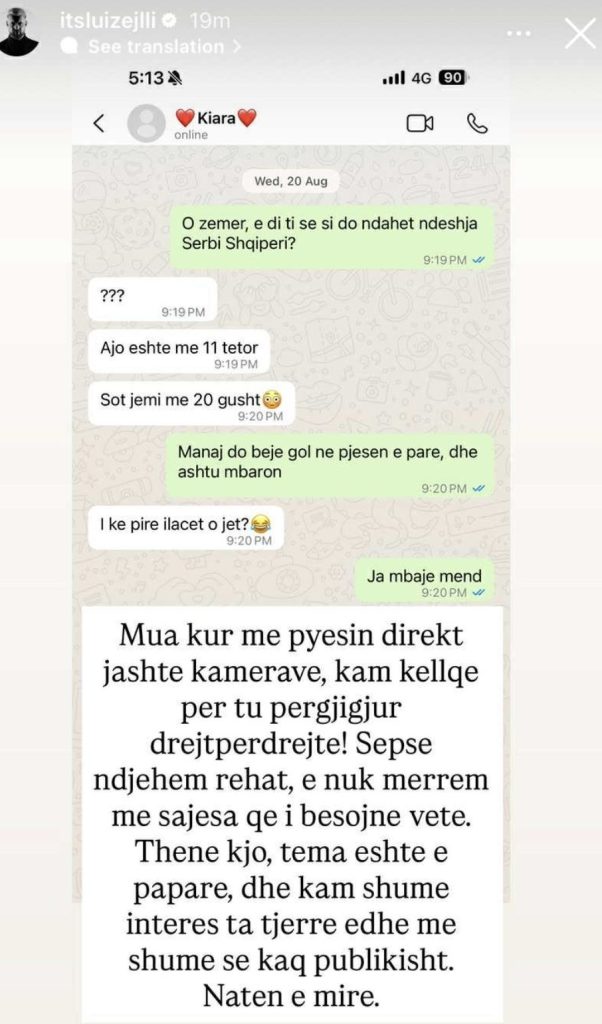Pas kësaj, nuk vonoi edhe reagimi i bashkëshortit të Kiarës, Luiz Ejllës. Ai zgjodhi një mënyrë ironike për të dhënë përgjigjen e tij krijoi një bisedë me inteligjencën artificiale, duke diskutuar për sportin në një datë të vendosur më parë: 20 gusht.