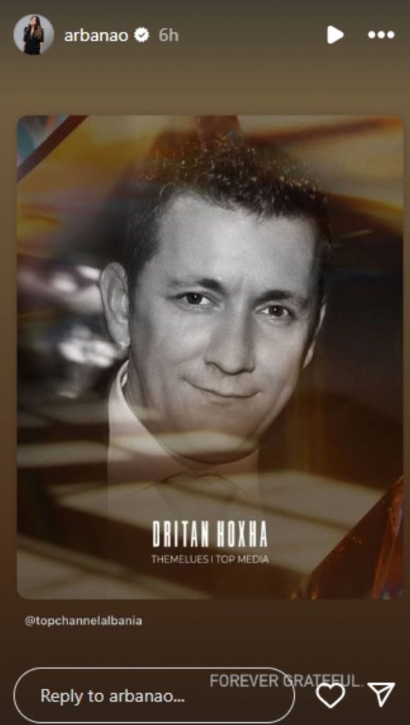 Pak orë më parë, Arbana publikoi një postim të ndjerë për themeluesin e Top Medias, Dritan Hoxhën, duke e kujtuar me respekt dhe dashuri.