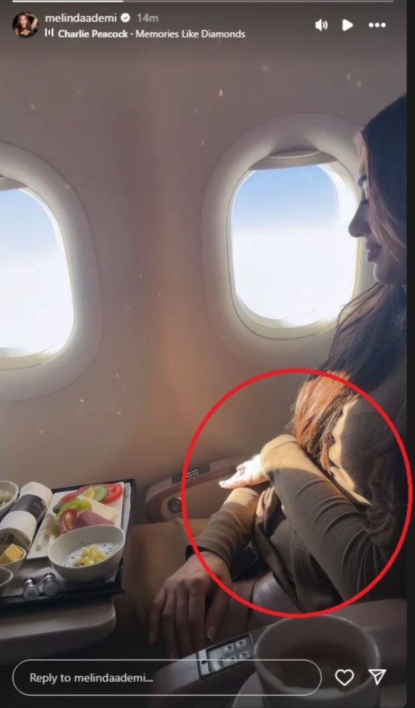 Në Instastory ndau pamje ku shihet brenda në avion. Ajo reklamoi unazën e saj me diamante, por ra në sy barku i saj.