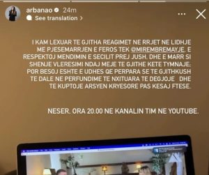 “I kam lexuar të gjitha reagimet në rrjet në lidhje me pjesëmarrjen e Feros tek @mirembremajuve. E respektoj mendimin e secilit prej jush, dhe e marr si shenjë vlerësimi ndaj meje të gjithë këtë tymnajë; por besoj është e udhës që përpara se të gjithë të dalin në përfundime të nxituara, të dëgjojnë dhe të kuptojnë arsyen kryesore pas kësaj ftese,”- shkruan Arbana.