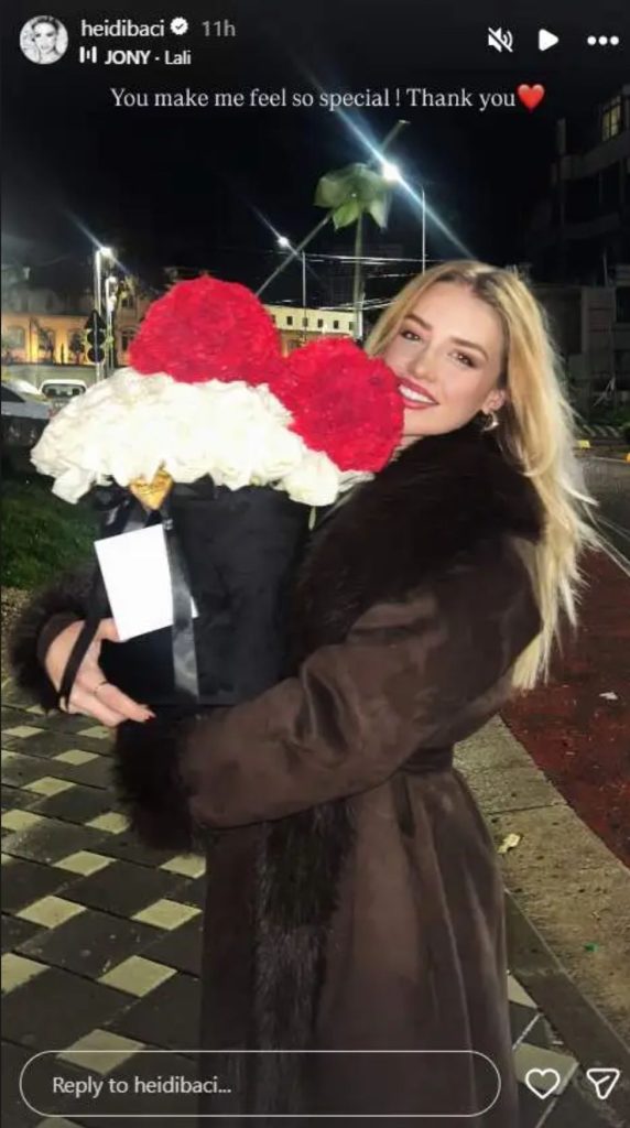 Në fotografitë e publikuara, Heidi shfaqet me një buqetë të madhe lulesh dhe një tortë të personalizuar me dedikim romantik. Gjithçka duket e kuruar me delikatesë, duke krijuar atmosferën e një surprize të menduar posaçërisht për të. Ajo shihet e buzëqeshur dhe e lumtur, ndërsa mesazhet e shkruara prej saj kanë bërë menjëherë bujë në rrjet.