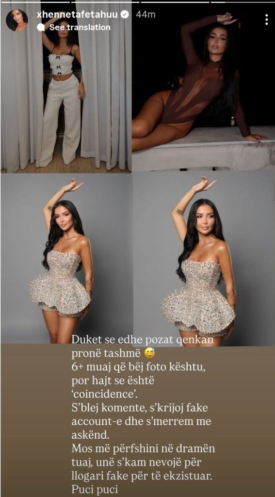 E vënë përballë këtyre akuzave, Xheneta ka vendosur të mos heshtë. Përmes një Story në Instagram, ajo ka reaguar ashpër, duke hedhur poshtë të gjitha zërat. Ajo ka publikuar një kolazh me fotot e saj dhe ka shkruar: