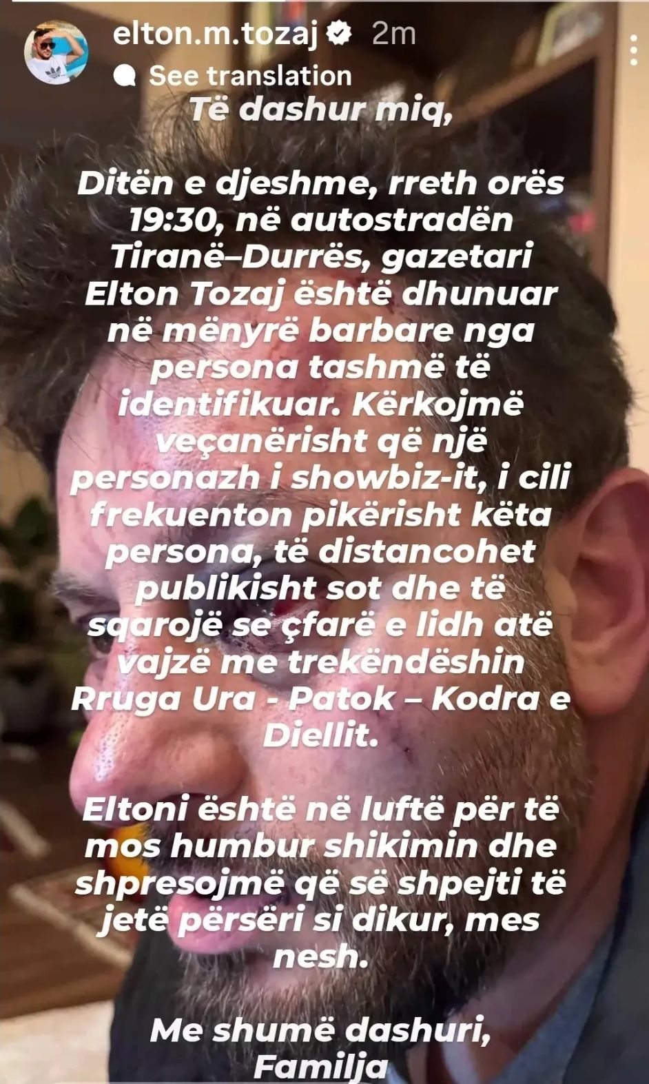 Familja ka bërë të ditur se Elton Tozaj ndodhet aktualisht në gjendje të rënduar shëndetësore dhe po merr trajtim intensiv mjekësor. Sipas tyre, situata është delikate, pasi gazetari po lufton për të mos humbur shikimin, çka e bën edhe më alarmante këtë ngjarje.
