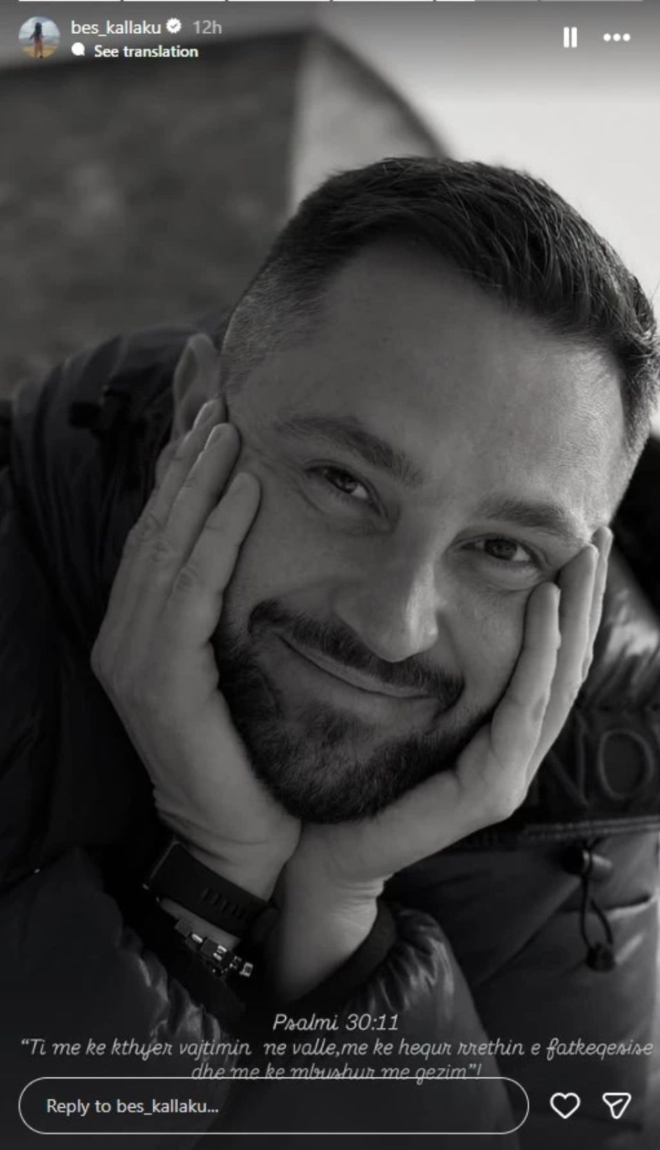 Përmes një fotografie bardhë e zi, ku duket i qetë dhe duke buzëqeshur, ai ka cituar Psalmin 30:11: “Ti më ke kthyer vajtimin në valle, më ke hequr rrethin e fatkeqësisë dhe më ke mbushur me gëzim!”