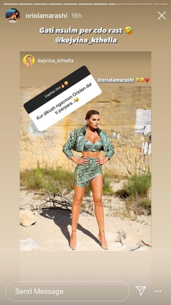 Dy vajzat nuk kanë ngurruar të tregojnë se lidhja e tyre është aq e fortë sa nëse njëra prej tyre ndodhet në një situatë jo të këndshme, tjetra i del në mbrojtje. Ish-velina publikoi kohë më parë një fotot në “Instastory” duke shkruar: “Vendosni një përshkrim kësaj fotoje”. Asokohe, një fans i shkroi: “Kur dikush ngacmon Oriola Marashin dhe del ti përpara”. “Gati në sulm për çdo rast”, shkroi më pas Oriola.