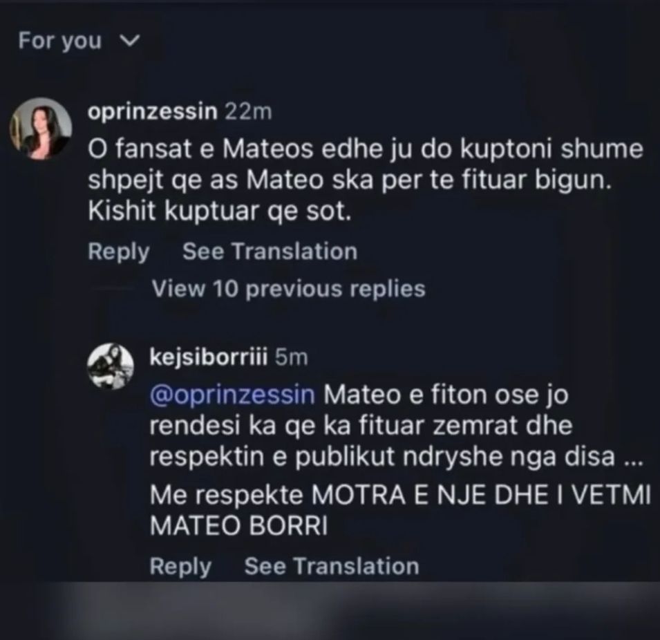 “Mateo e fiton ose jo, rëndësi ka që ka fituar zemrat dhe respektin e publikut ndryshe nga disa… Me respekte MOTRA E NJE DHE I VETMI MATEO BORRI”-ka replikuar ajo.