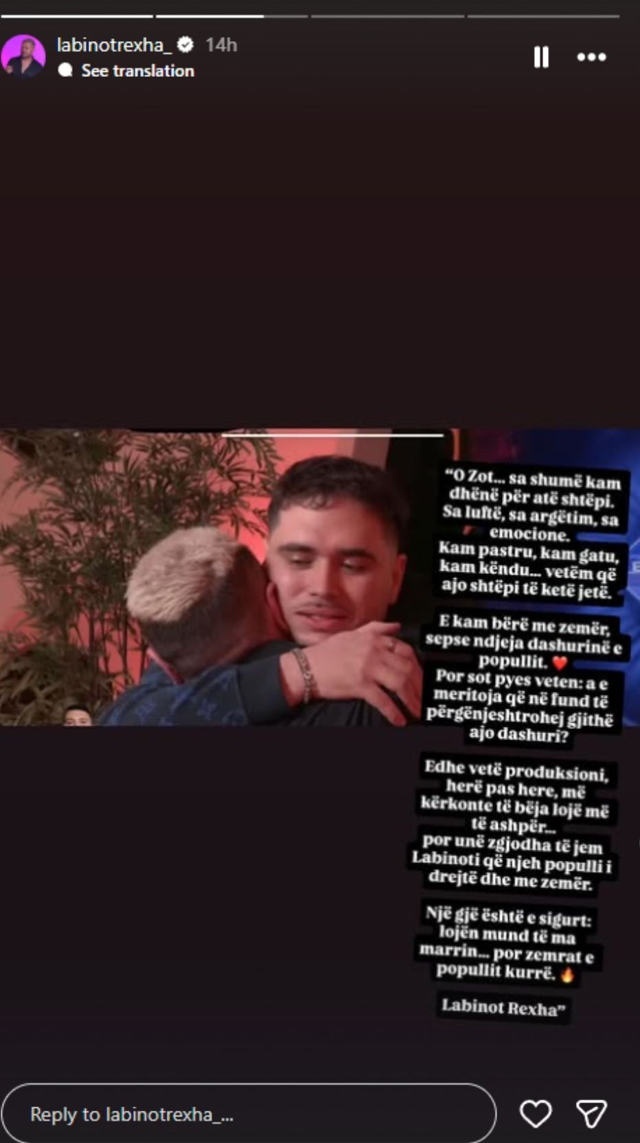 Një gjë është e sigurt:lojën mund të ma marrin… por zemrat e popullit kurrë.Labinot Rexha”.