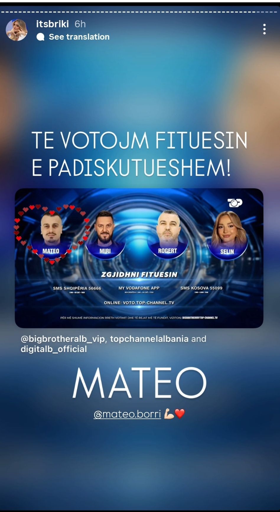Që prej orës 4 të mëngjesit, i vetmi postim origjinal në Story-n e saj në Instagram, përpos një lumi ripostimesh, i dedikohej ekskluzivisht betejës së Mateos për çmimin e madh.