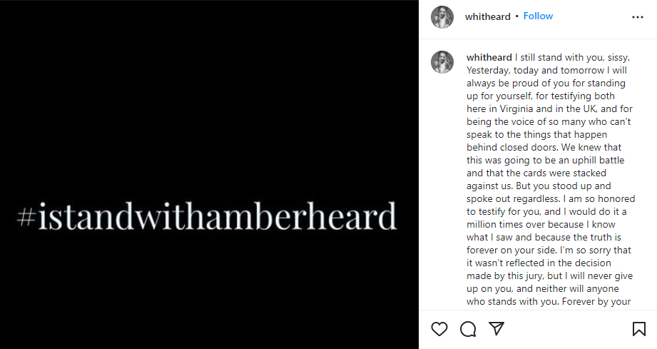 Whitney Henriquez ndau mbështetjen e saj për Amber Heard, disa ditë pasi juri vendosi në favor të ish-kunatit të saj. Ajo tha se do të dëshmonte përsëri të njejtën gjë. Fotografia e bashkangjitur me mesazhin ishte vetëm një hashtag — #istandwithamberheard.