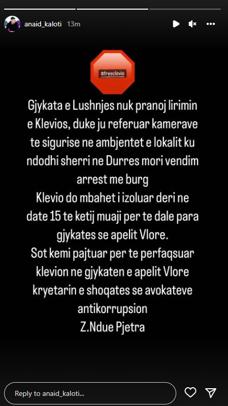 Sipas ish-banorit të “Big Brother”, Anaid Kaloti, gjykata nuk e ka pranuar lirimin e reperit duke lënë në fuqi vendimin “arrest me burg.” Në një postim në Instastory, ish-banori shton se Kleviol Ahmeti do të mbahet i izoluar deri në datë 15 maj të këtij muaji.