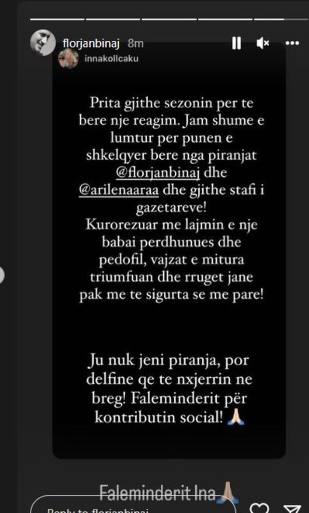 Ndërkohë si për mbyllje Binaj ka marrë një mesazh urimi nga Ina Kollçaku i cila u bë e famshme në Përputhen në Top Channel. Ina e ka cila e ka përgëzuar për punën ku i shkruan: “Ju nuk jeni Piranja por jeni delfinë që të nxirrni në breg”. Këtë mesazh aktori ka zgjedhur ta postojë në profilin e tij.