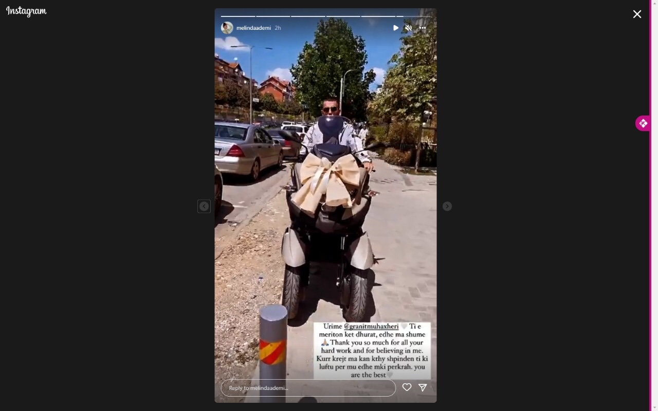 “Urime Granit Muhaxheri. Ti e meriton këtë dhuratë edhe më shumë. Falemnderit për të gjithë punën e amdhe dhe që besove në mua. Kur të gjithë ma kanë kthy shpinën, ti ke luftuar për mua dhe më ke përkrahur. Je më i miri”.
