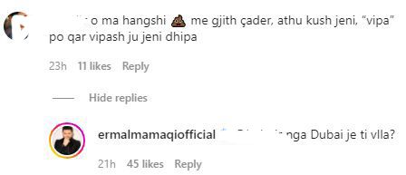 “@blerimdestani, projekti tjeter. Ka 100 vjet që më lutet”- shkroi Mamaqi krahas videos. Mirëpo një ndjekës duket se nuk i ka pëlqyer aspak videoja e aktorit dhe komenti i tij mori vëmendjen e Ermalit i cili nuk ka nguruar t’i kthejë një përgjigje më se epike.