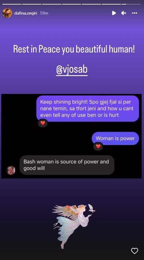 Një prej tyre është dhe këngëtarja Dafina Zeqiri e cila nëpërmjet një InstaStory ajo ka publikuar bisedën e saj të fundit me Vjosën dhe krahas saj shkroi: “U prefsh në paqe o njeri i bukur”.