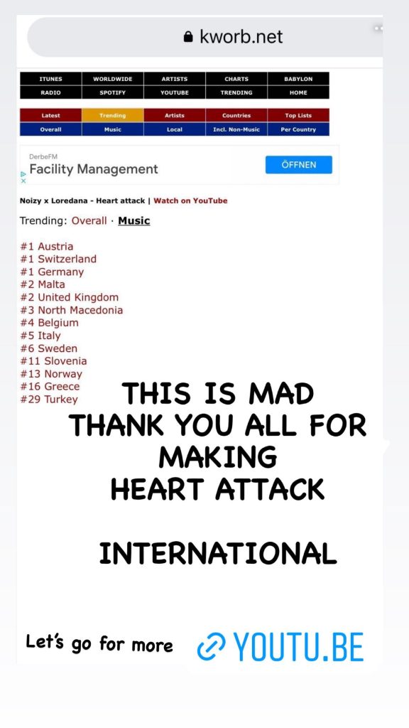 Trendit i është bashkuar edhe Noizy. Kënga e tij dhe Loredanës është e dyta ‘on trending’ në Britani dhe ‘top 5’ në shumë vende të tjera. Pasi ka publikuar të dhënat reperi ka shpërndarë edhe një video ku thotë: “Unë atë e bëra kastile.