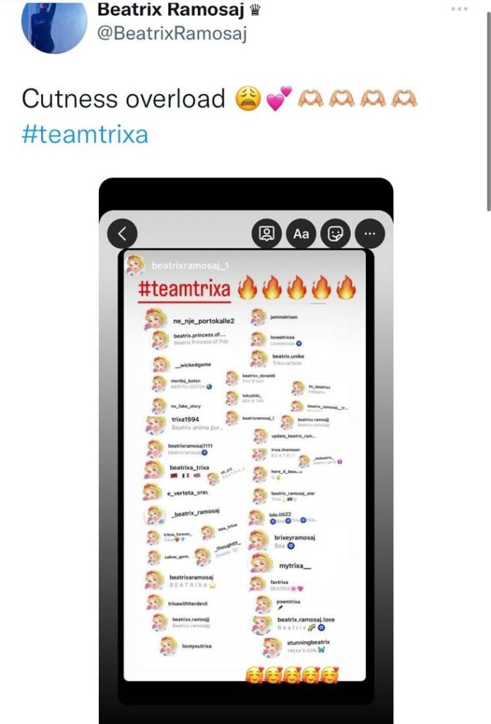 Nga ana tjetër Beatrix Ramosaj ka zgjedhur rrjetin social Twitter për të falendëruar ndjekësit e saj. Ajo që vihet re është se videoja e fansave të Borës dhe Beatrix është shumë e ngjashme, ku shihet se fansat e tyre kanë krijuar llogari të shumta në mbështetje të tyre.