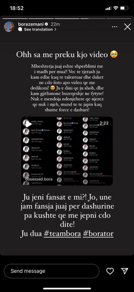 Me anë të një postimi në Instastory, Bora Zemani ka treguar një video që fansat e saj kishin krijuar. Krahas videos, moderatorja ka bërë një shkrim falendërues për të gjithë fansat e saj.