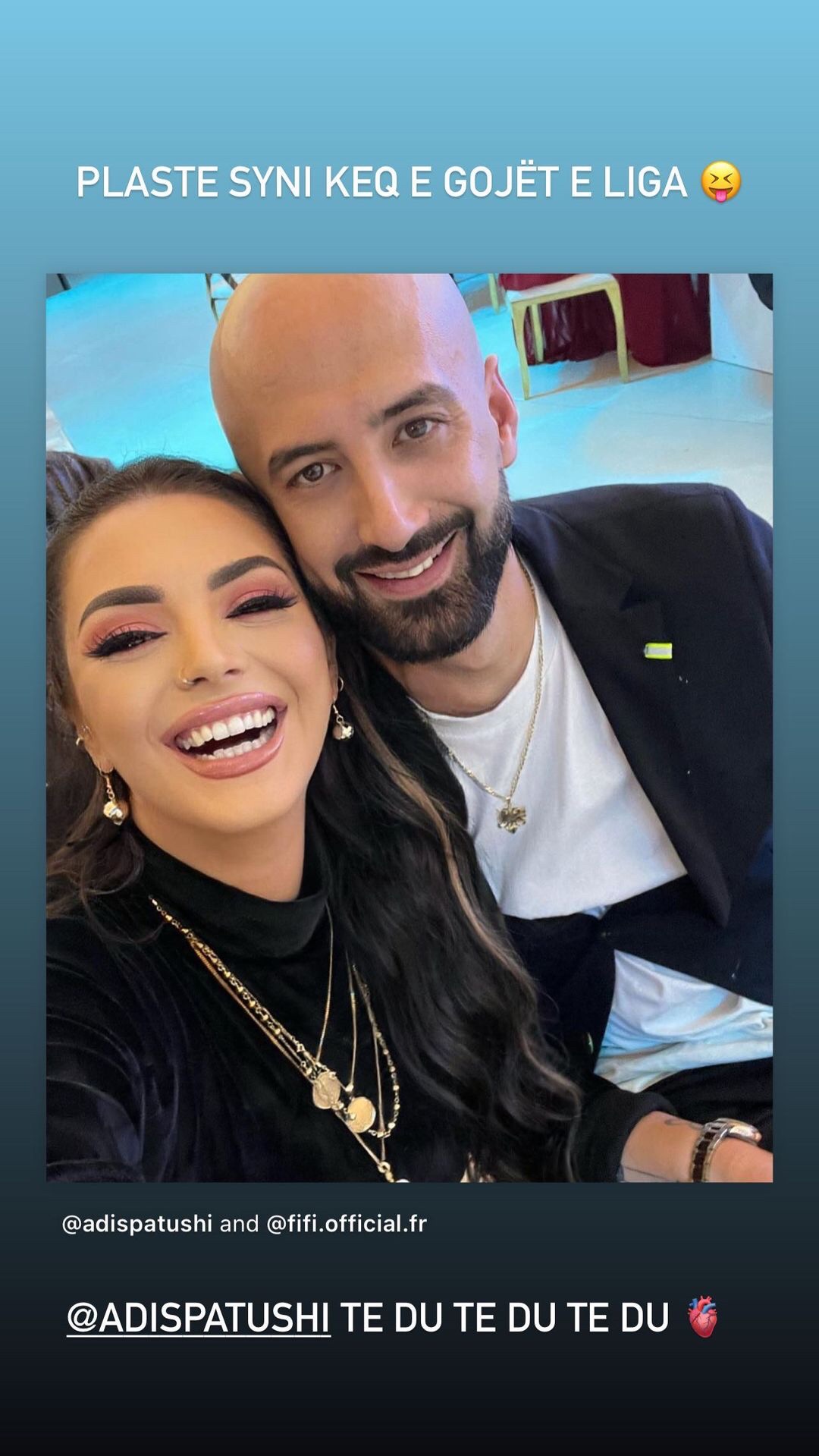 Pak ditë pas përplasjes me Zhaklin Lekatari, Fifi ka ironizuar përmes rrjeteve sociale. Këngëtarja ka publikuar një foto, ku shihet shumë e lumtur prah të dashurit të saj, Adis Patushi, krahas së cilës ka shkruar disa fjalë thumbuese. “Plastë syni i keq dhe gojët e liga. @Adis Patushi, të du, të du”.”, shkroi ajo.