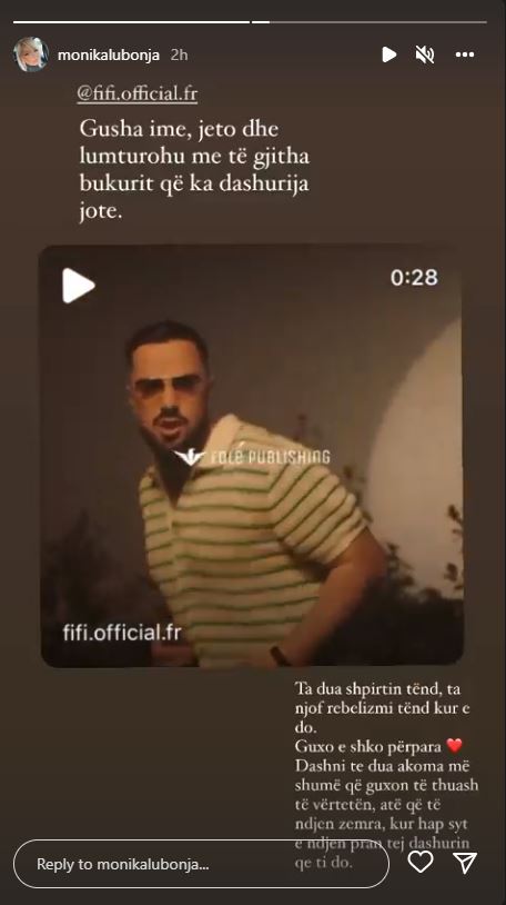 “Gusha ime, jeto dhe lumturohu me të gjitha bukuritë që ka dashuria jote. Ta dua shpirtin tënd, ta njoh rebelizmin kur e do. Guxo e shko përpara. Dashuri të dua akoma më shumë që guxon të thuash të vërtetën, atë që të ndjen zemra kur hap sytë, e ndjen pranë teje dashurinë që ti do,”-shkruan Monika.