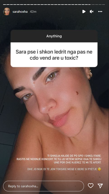 “Ti shkoja hajde de, por s’po i shkoj fare. Rastis në ndonjë koncert të tij jo vetëm sepse dua të shkoj unë, por edhe njerëz të mi të afërt. Dhe jo nuk di të jem toksike meqë e bëre si pyetje.”– shkruan Sara në Instastory.