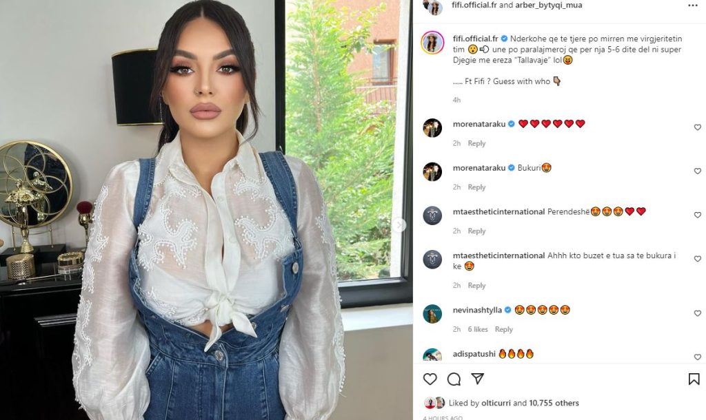 “Ndërkohë që të tjerët po merren me virgjeritetin tim 😮💨 une po paralajmëroj që për nja 5-6 ditë del ni super Djegie me ereza “Tallavaje” lol😝”– paralajmëroi Fifi duke ironizuar kështu fjalët e Zhaklinës teksa e cilësoi artisten si një “këngëtare tallavaje”.
