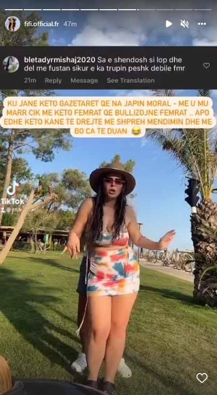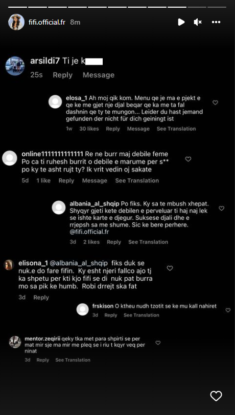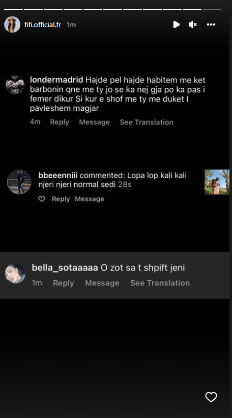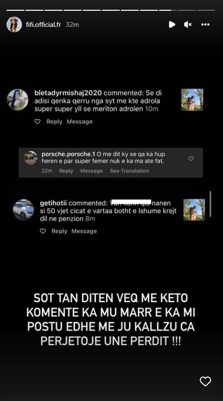 “Sa e shëndoshë si lopë dhe del me fustan sikur e ke trupin peshk, debile femër.”– thuhet në koment, ndërsa Fifi shkruan në Instastory: “Ku janë këto gazetarët që na japin moral, të merren pak me këto femrat që bullizojnë femrat… Apo edhe këto kanë të drejtë të shprehin mendimin dhe të bëjën çfarë të duan.”