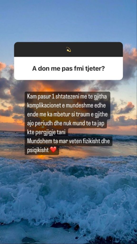 “Kam pasur një shtatzëni me të gjitha komplikacionet e mundshme dhe ende më ka mbetur si traumë e gjithë ajo periudhë. Nuk mund të të jap këtë përgjigje tani. Mundohem ta marr vetën fizikisht dhe psikologjikisht,” është shprehur ajo.