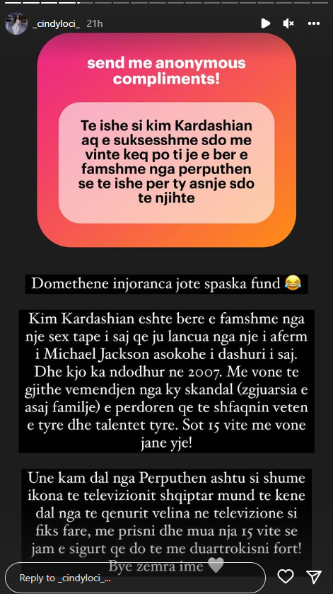 “Të ishe si Kim Kardashian aq e suksesshme s’do më vinte keq, po ri je bërë e famshme nga ‘Për’puthen’ se të ishe për ty asnjë s’do të njihte”– shkroi ndjekësi.