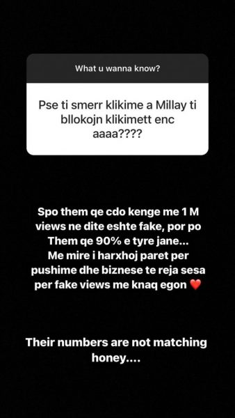 “S’po them që çdo këngë me një milion klikime në ditë është fals, por po them që 90 për qind e tyre janë…Më mirë i harxhoj paratë për pushime dhe biznese të reja sesa për klikime false me kënaq egon. Numrat e tyre nuk përputhen mjalti im”, shkroi Enca.