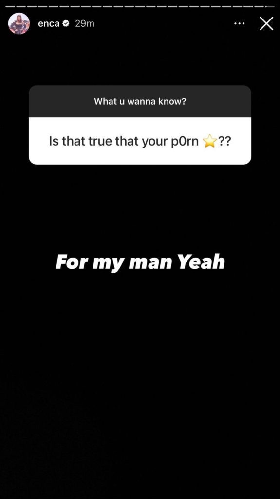 Këngëtarja ka realizuar një ‘intervistë virtuale’ me ndjekësut e saj në Instagram duke iu përgjigjur disa nga pyetjeve që ata kanë për të. Mes të tjerash dikush e ka pyetur Encën nëse është e vërtetë që është një pornostare. Kjo pyetje nuk ka ngelur pa një përgjigje nga Enca e cila është përgjigjur: “Për të dashurin tim po.”