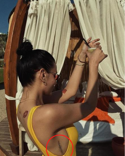 Në fotot e publikuara vihet se Bora ka një tatuazh abstrakt anash gjoksit.